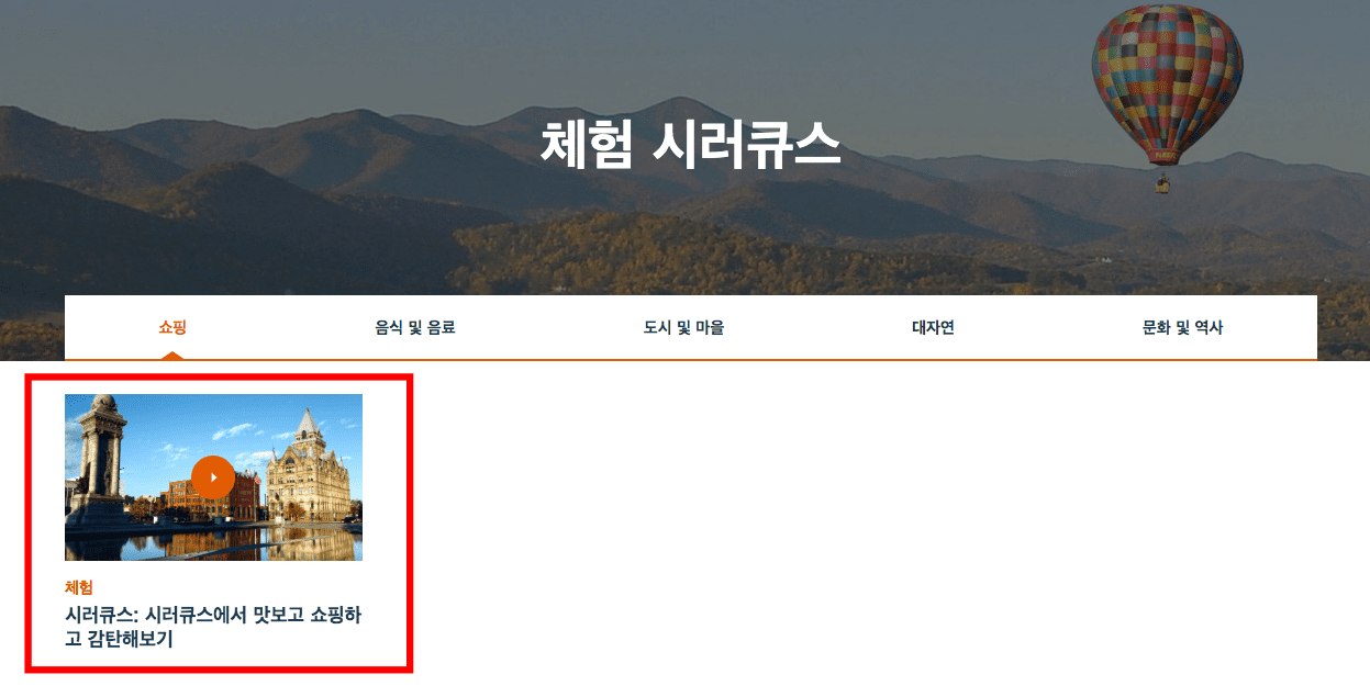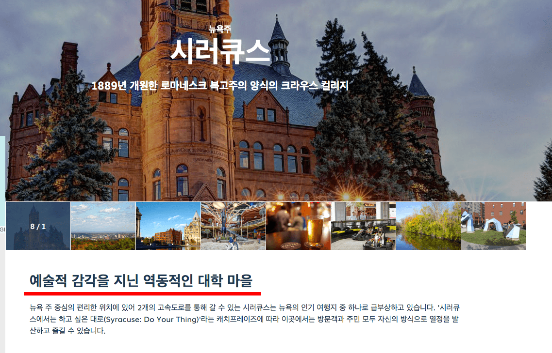 시러큐스에 대한 다양한 정보도 한글로 자세히 정리가 되어 있습니다. 하단의 체험 시러큐스 영역으로 이동하면 체험해야 할 콘텐츠 소개도 꼭 확인해 보시기 바랍니다.
