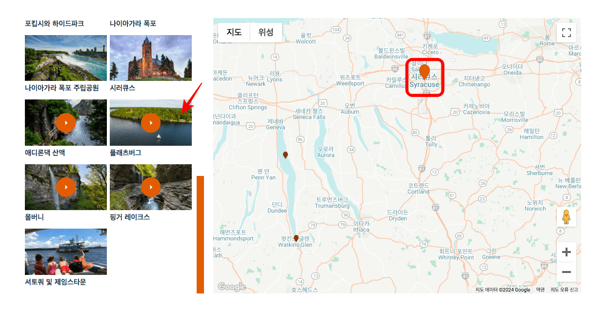 뉴욕주에서 유명한 시러큐스를 지도에서 확인해 보았습니다. 이후 좌측의 시러큐스 관련 콘텐츠를 클릭합니다. 시러큐스 여행지에 대한 동영상 시청도 가능합니다.