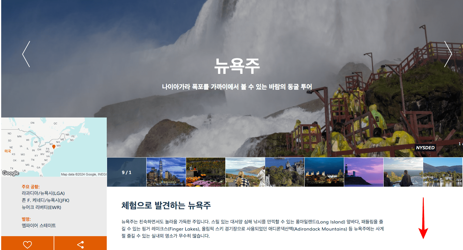 뉴욕주 페이지가 나오면 스크롤을 하단으로 내립니다. 중간쯤에 뉴욕주 목적지 탐색 화면이 보이게 됩니다. 지도 위에서 주황색 아이콘으로 표시된 곳이 뉴욕주의 명소들입니다. 우측 하단의 +-버튼을 클릭하면 지도를 확대 또는 축소해 볼 수 있습니다.