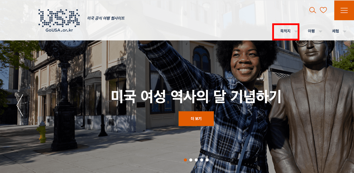 GOUSA 홈페이지에 도착하시면 위와 같은 메인 페이지를 확인할 수 있습니다. 먼저 우측 상단 메뉴에서 ‘목적지’를 선택합니다. 위치별로 50개의 주가 보이면 방문할 지역을 선택합니다. 여기에서는 뉴욕주를 선택해 보았습니다.