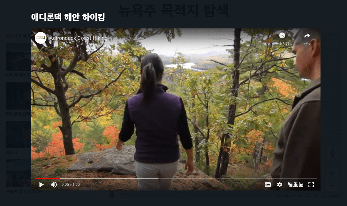 뉴욕주에서 유명한 시러큐스를 지도에서 확인해 보았습니다. 이후 좌측의 시러큐스 관련 콘텐츠를 클릭합니다. 시러큐스 여행지에 대한 동영상 시청도 가능합니다.