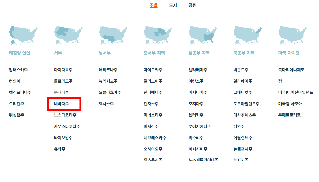 이번에는 라스베이거스로 유명한 서부의 네바다주 지도를 확인해 보도록 하겠습니다. 상단 메뉴 목적지 > 주 선택 메뉴에서 네바다주를 선택합니다. 네바다주에 대한 정보가 표시되면 스크롤을 내립니다.