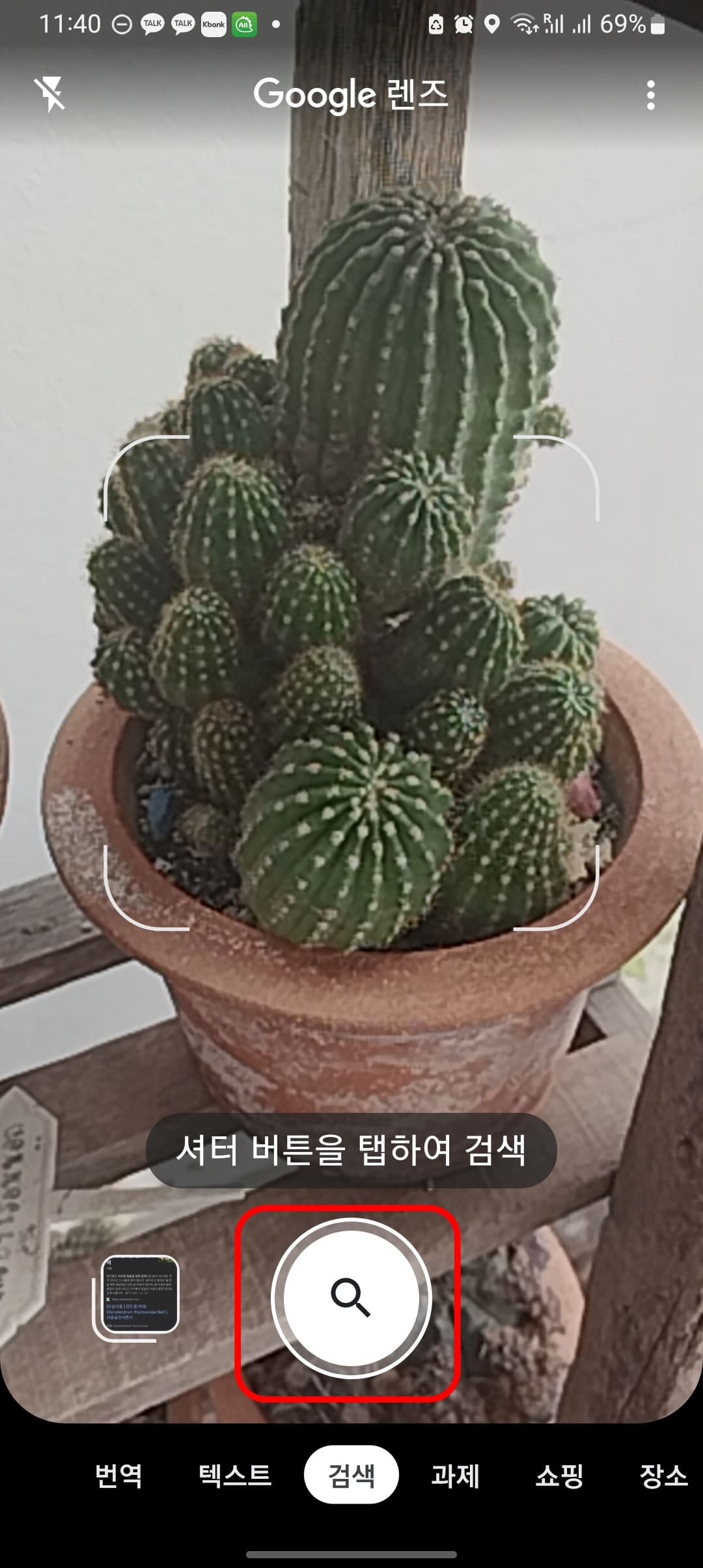 구글 렌즈를 실행하시면 상단에서 카메라로 검색 메뉴를 터치합니다. 이어 카메라 모드가 실행되면 둥근 사각형 틀에 최대한 맞추고 하단 셔터버튼을 터치하여 식물을 촬영합니다.