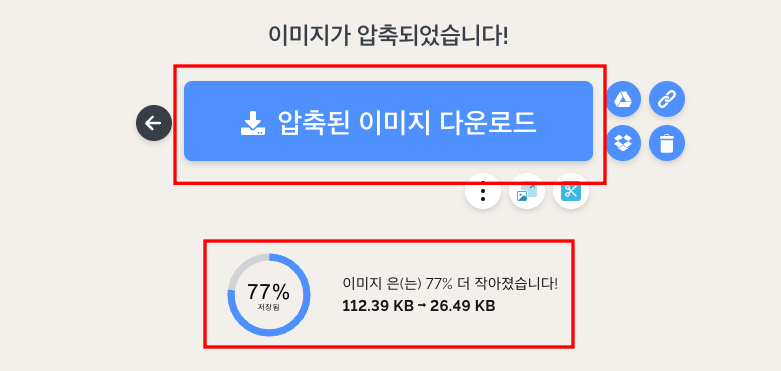 ‘이미지가 압축되었습니다!’ 가 표시되면 압축된 이미지 다운로드 버튼을 클릭하여 이미지를 PC에 저장합니다. 이번 압축을 통해 77%나 용량을 줄일 수 있었습니다.