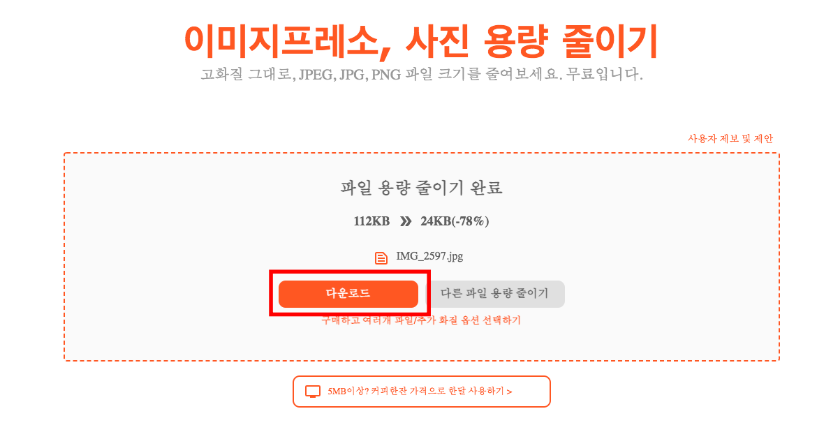 이미지가 78%나 압축된 것을 확인할 수 있습니다. 다운로드 버튼을 클릭하여 PC에 압축된 이미지를 저장합니다.