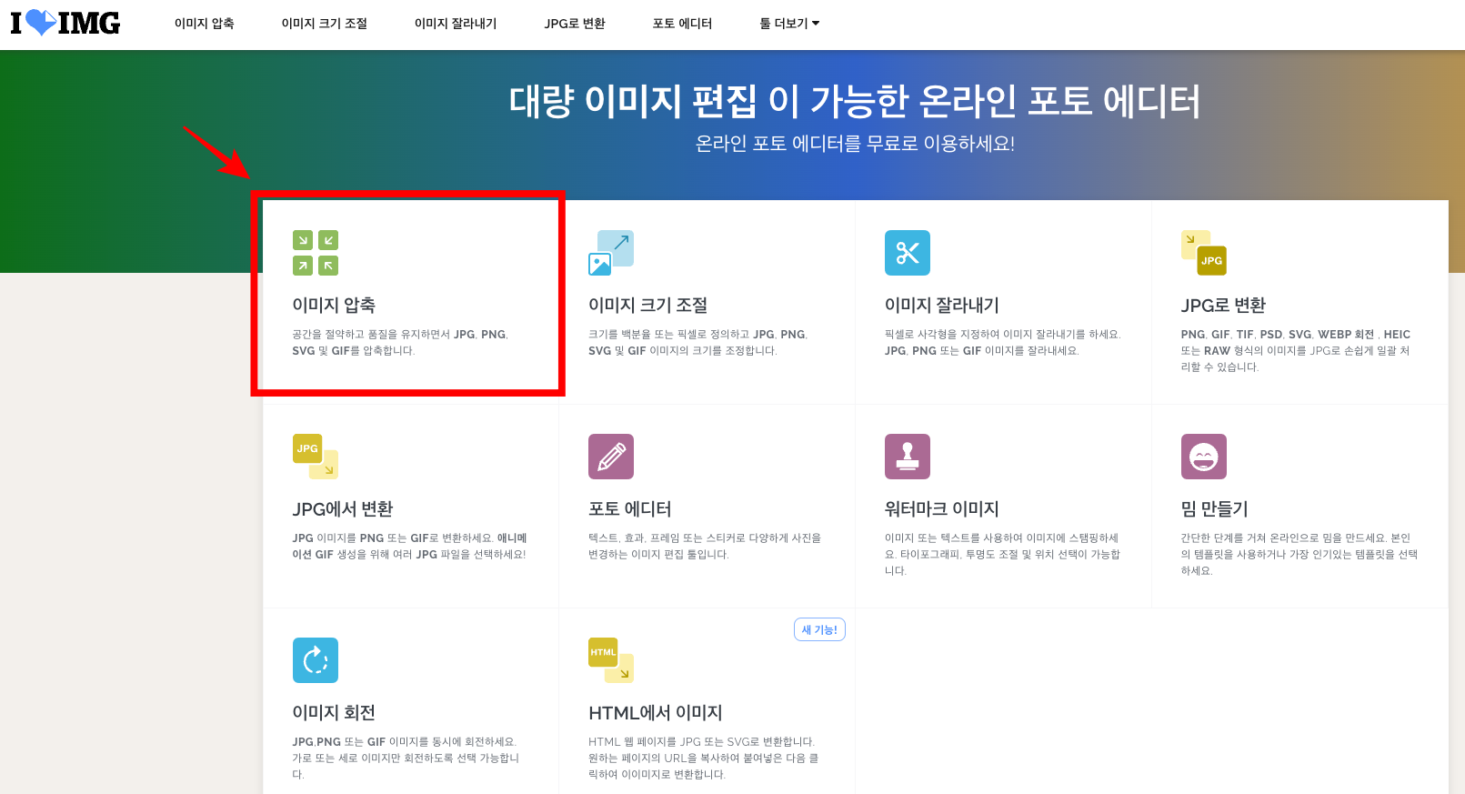 아이러브이미지는 온라인에서 간단하고 빠르게 이미지 크기 조절, 이미지 압축, 이미지 변환 등의 서비스를 로그인 없이 이용할 수 있는 대표적인 사이트입니다. 아래의 링크를 통해 방문합니다.