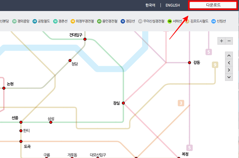 앞에서 수인분당선 노선도 크게보기 방법을 알아보았으니 이번에는 노선도 이미지 다운로드 방법을 알아보겠습니다. 먼저 서울교통사 사이버스테이션 메인 페이지에서 우측 상단의 다운로드 버튼을 클릭합니다.