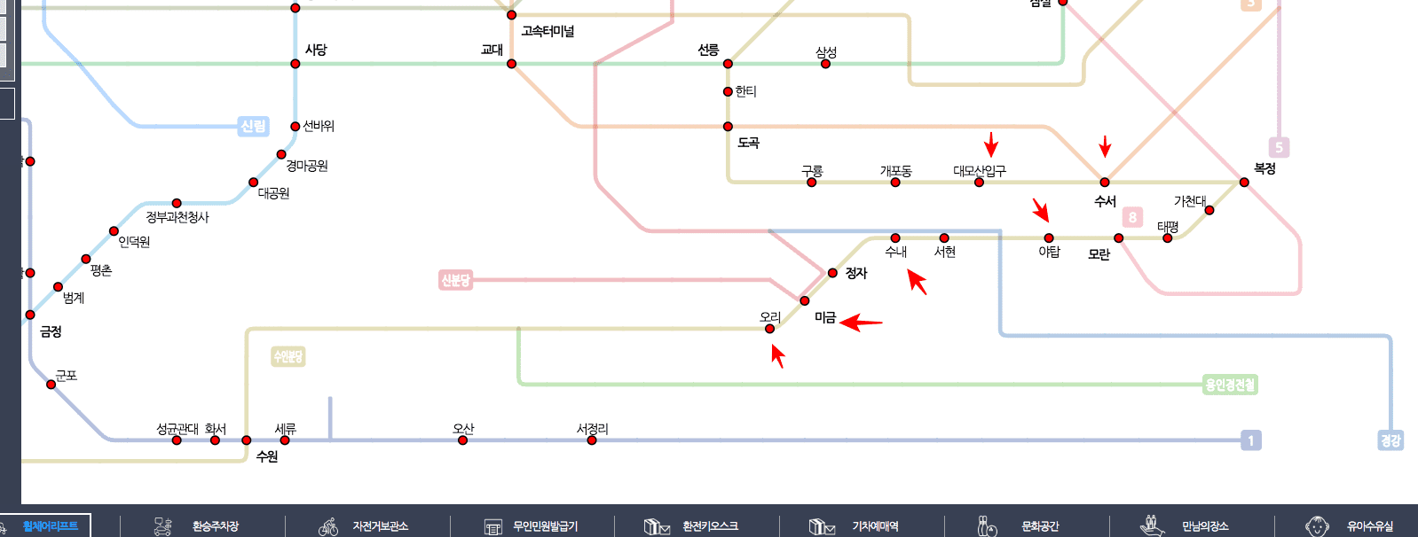 수인분당선 내의 편의시설 검색을 원하신 다면 하단의 편의시설 메뉴를 클릭하여 구비된 역을 조회할 수 있습니다. 여기에서는 휠체어리프트를 선택해 보도록 하겠습니다. 수인분당선에서 휠체어리프트가 설치된 역은 오리, 미금, 수내, 서현, 야탑, 수서, 대모산입구, 개포동 등임을 확인할 수 있습니다.