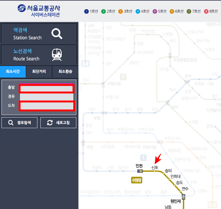 각 역의 출발역과 도착역을 좌측 메뉴에서 입력하거나 노선도에서 선택하여 지정하면 최단거리 조회가 가능합니다. 여기에서는 수인분당선인 신포에서 신갈까지의 최단거리를 확인해 보았습니다. 소요시간은 93분, 요금은 현금 시 2350원 카드이용 시 2250원임을 확인할 수 있습니다.