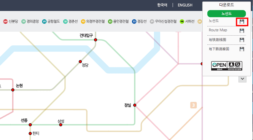 이후 세부 메뉴에서 노선도 옆의 플로피 디스크 아이콘을 클릭하면 큰 이미지 파일이 담겨있는 압축파일이 PC에 저장됩니다.