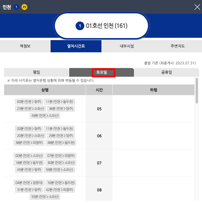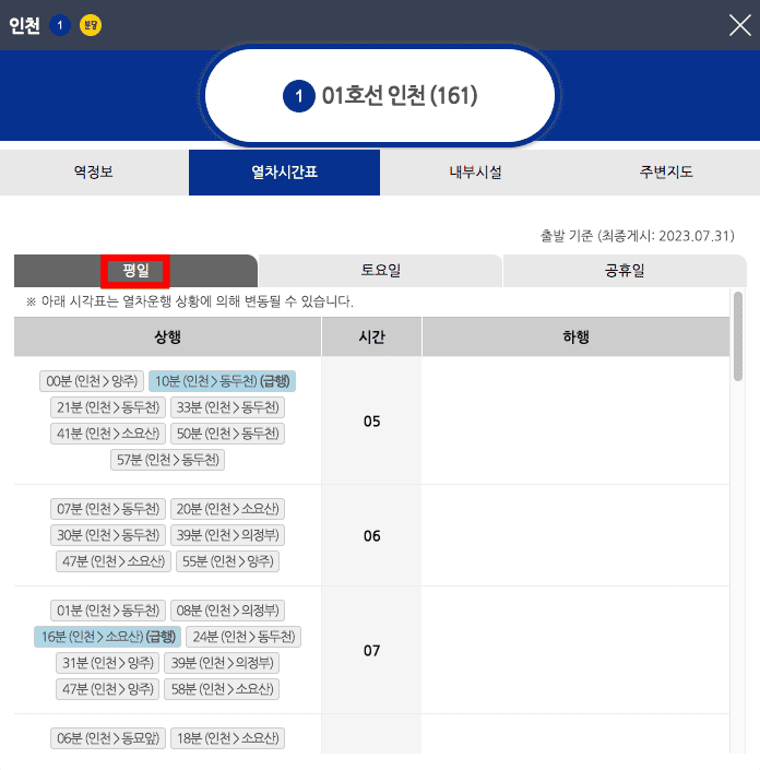 각 역의 출발 및 도착 시간표를 확인하시려면 노선도에서 역을 선택하고 시간표 버튼을 클릭합니다. 열차시간표에서 평일, 토요일, 공휴일 일반 및 급행 시간표를 자세히 살펴볼 수 있습니다.