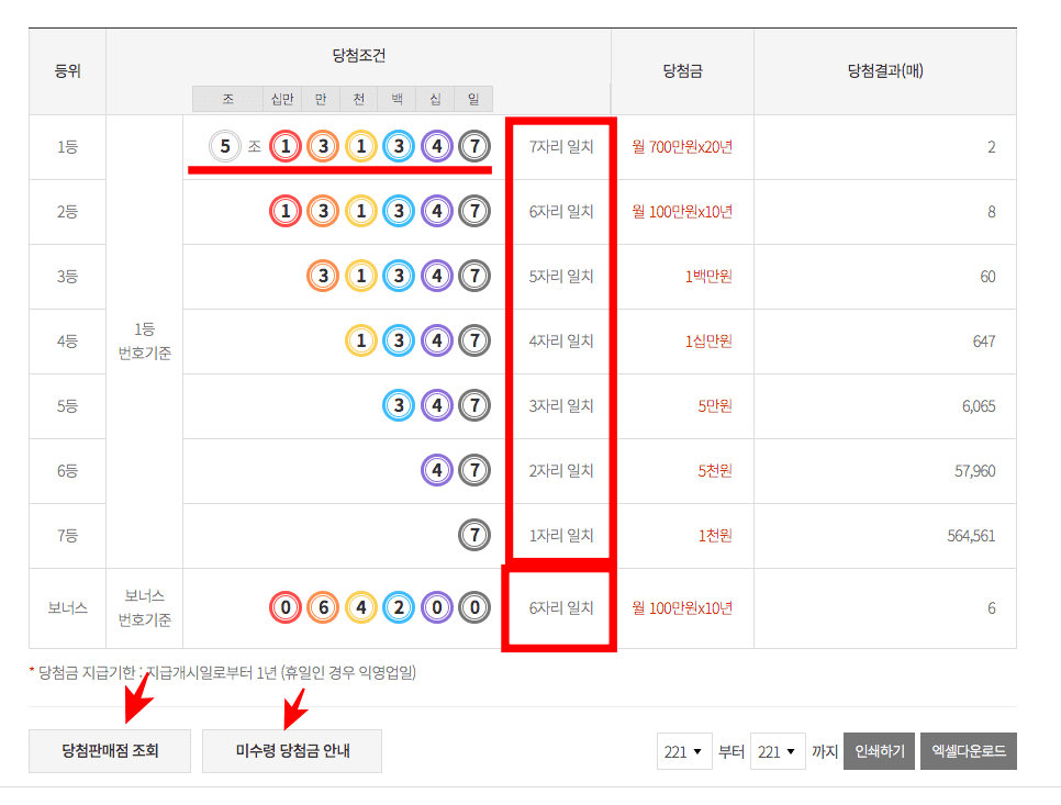 이후 하단을 확인하시면 연금복권 당첨번호 보는법을 자세히 확인할 수 있습니다. 먼저 1등은 7자리 숫자가 모두 일치해야 합니다. 5조 131347이 221회 차 1등 번호입니다. 2등은 조 뒤의 6 숫자가 일치해야 합니다. 3등은 5자리 일치, 4등은 4자리 일치, 5등은 3자리 일치 6등은 2자리 일치, 7등은 1자리 일치이니 잘 기억하시기 바랍니다. 보너스 번호는 2등과 똑같은 당첨금 수령이 가능하지만 별도의 보너스 넘버 6자리가 일치해야 하며 모든 조가 해당될 수 있습니다.
