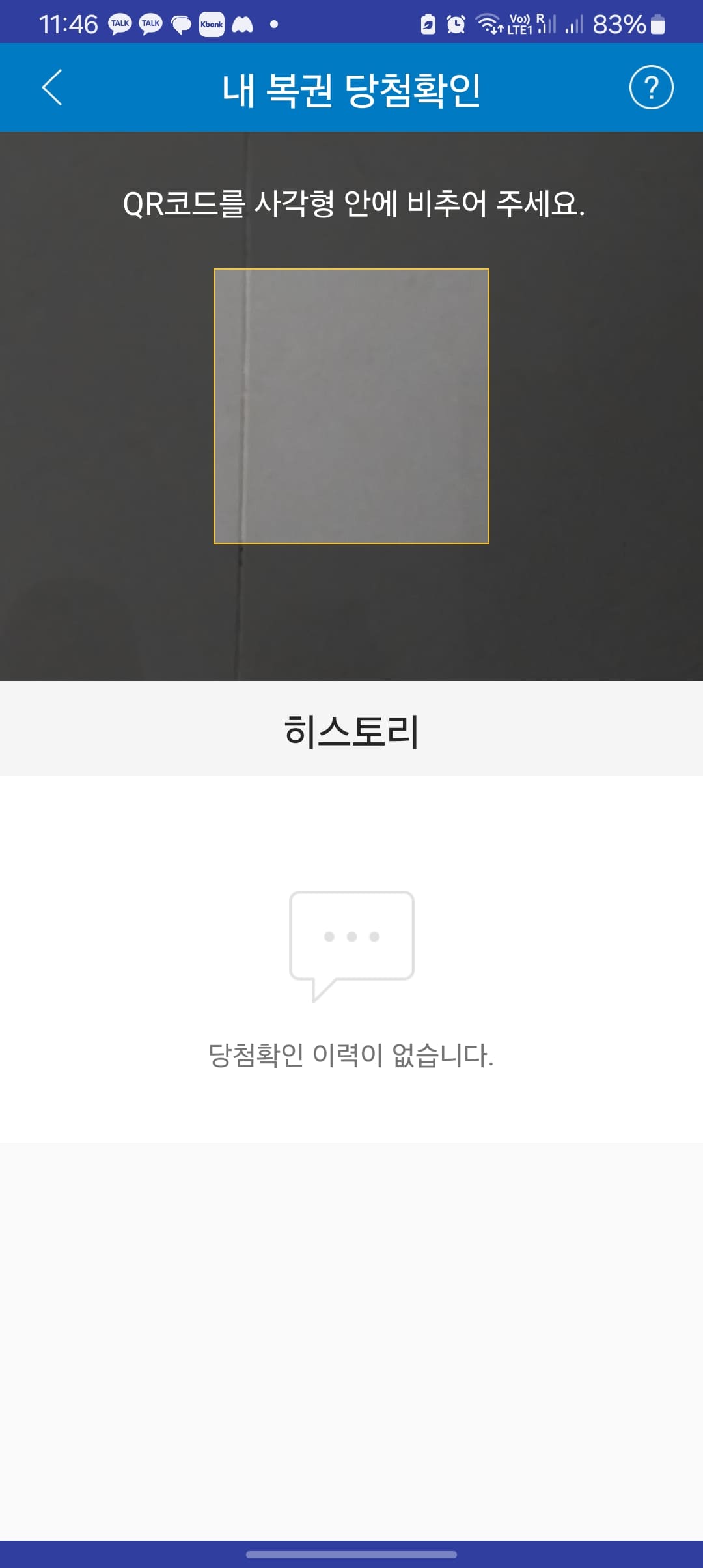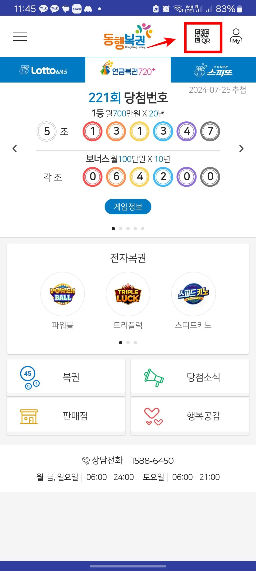 동행복권 앱을 설치하고 앱을 실행하면 위와 같은 첫 화면을 보게 됩니다. 우측 상단의 QR코드 아이콘을 터치합니다. 내 복권 당첨확인 페이지에서 카메라가 활성화되면 사각형 안에 연금복권의 QR코드를 스캔하시면 당첨결과 조회가 가능합니다.