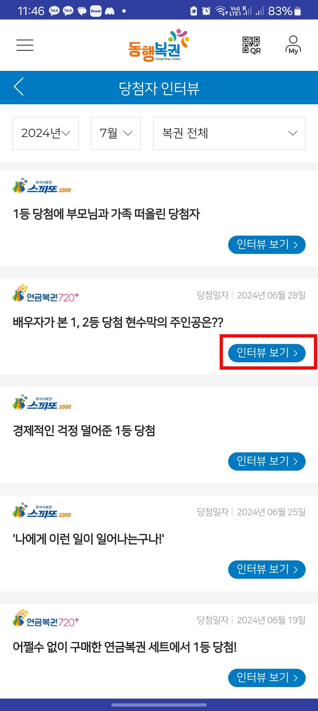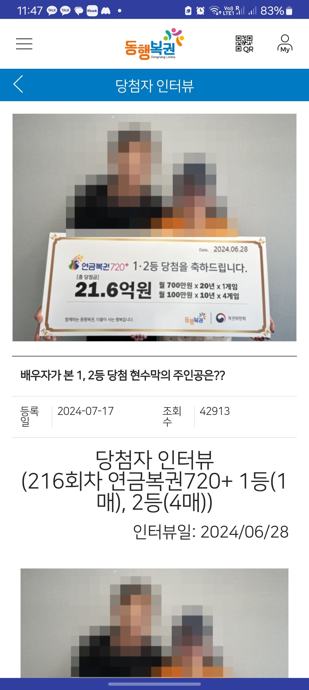 끝으로 동기부여를 위해 당첨자 인터뷰를 확인해 보도록 하겠습니다. 좌측 상단의 3선 아이콘을 터치합니다. 이후 당첨소식 > 당첨자 인터뷰를 순서대로 터치합니다. 연금복권 당첨자 중 인터뷰 보기를 터치합니다. 216회 차에 1,2등 당첨이 모두 되신 분의 사연을 들어 볼 수 있었습니다.