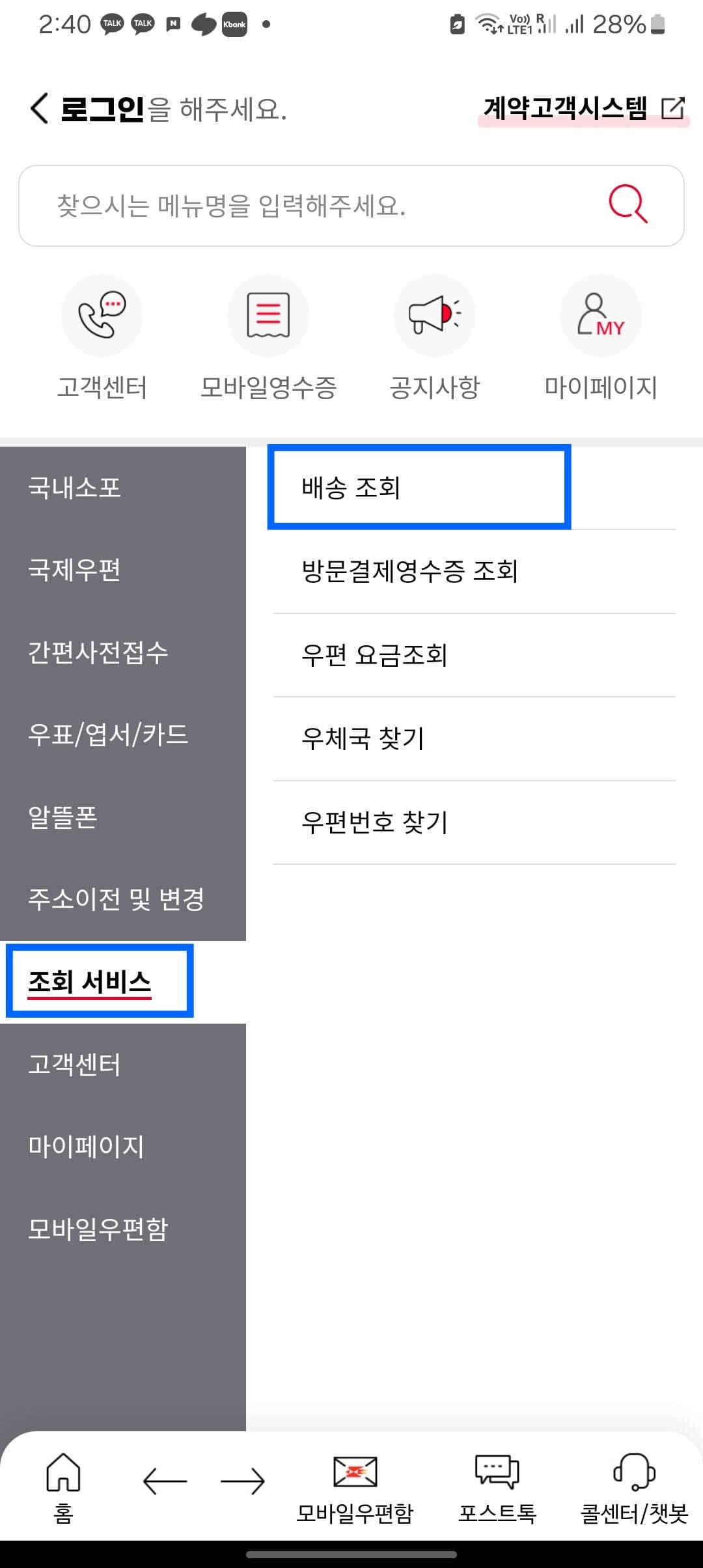우체국 어플을 실행하시면 위와 같은 메인 페이지가 보입니다. 왼쪽 상단의 3선 아이콘을 손가락으로 터치한 후 완쪽 메뉴에서 조회 서비스를 터치합니다. 이후 오른쪽 메뉴 상단에 있는 배송조회 메뉴를 터치합니다.