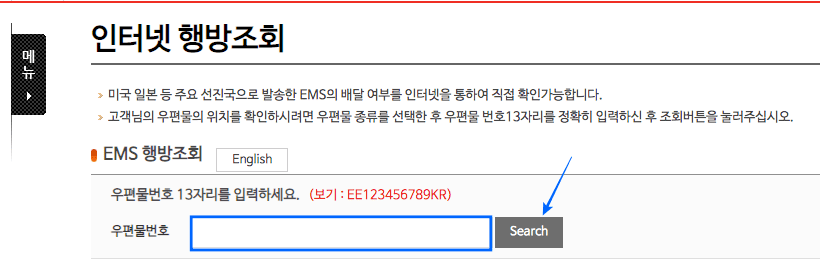 인터넷 행방조회 페이지가 표시되면 우편물 번호 입력란에 우체국 ems 우편물번호 13자리를 입력하고 오른쪽의 서치 버튼을 클릭하면 조회되니 직접 확인해 보시기 바랍니다.