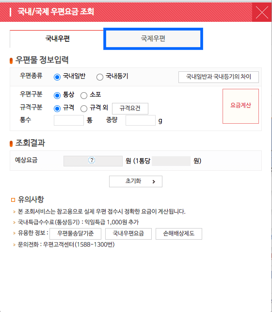 이후 도착국명, 통수, 실중량, 부피중량을 입력하시고 아래쪽의 확인버튼을 클릭하면 요금적용중량이 자동으로 입력됩니다. 이후 오른쪽 상단의 요금계산 버튼을 클릭하면 예상 요금 확인이 가능합니다.