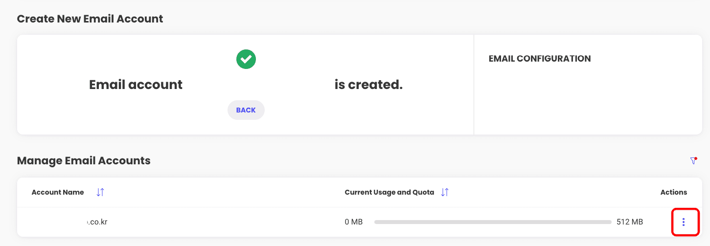 이메일 계정 이름과 패스워드 8자리를 입력한 후 하단의 Create버튼을 클릭합니다. 이메일이 정상적으로 생성이 되었습니다. 하단에서 생성된 이메일을 확인할 수 있습니다. 우측 끝에 있는 점 3개 아이콘을 클릭하여 로그인합니다.