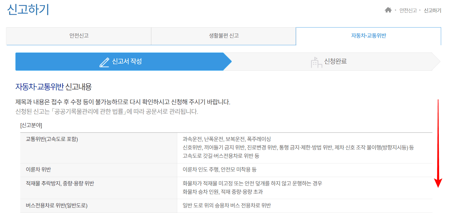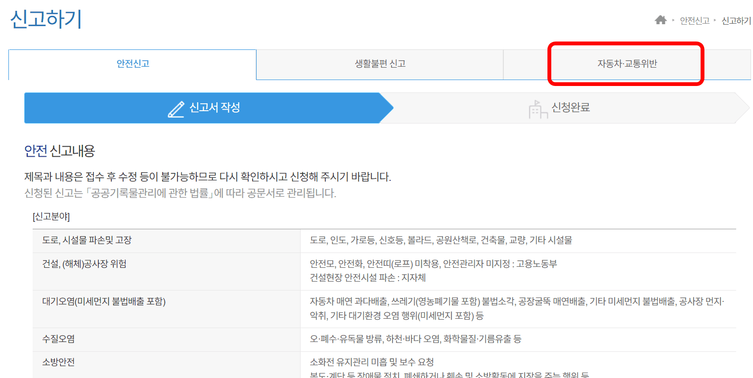 안전신문고 홈페이지에 접속하면 위와 같은 첫 페이지를 확인할 수 있습니다. 표시된 [신고하기] 메뉴를 클릭합니다. 신고하기 페이지는 안전신고, 생활불편 신고, 자동차 교통위반으로 나누어져 있습니다. 자동차 교통위반 메뉴를 선택합니다. 이후 자동차 교통위반 신고내용을 살펴보시고 스크롤을 내립니다.