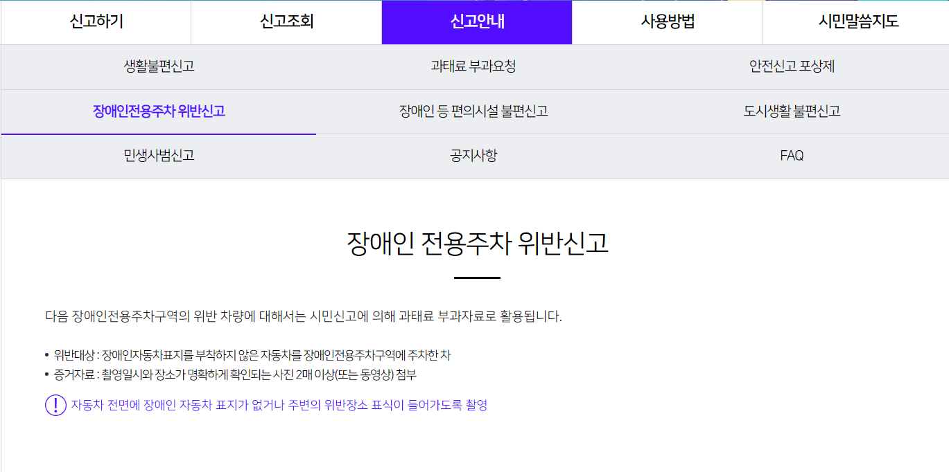 장애인 주차구역 위반을 PC나 모바일에서 신고하시려면 아래 내용을 확인하시기 바랍니다.