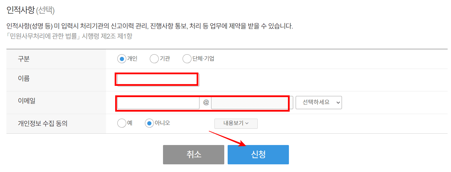 인적사항은 선택이며 이름과 이메일을 입력하면 진행사항에 대한 통보를 받을 수 있습니다. 최종적으로 하단의 신청 버튼을 클릭하면 장애인주차구역 위반 신고가 완료됩니다.