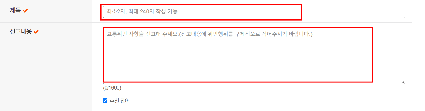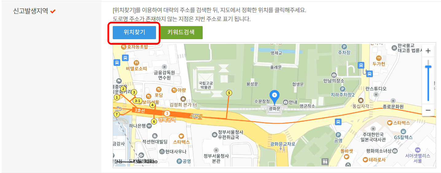신고발생 지역에 위치찾기 버튼을 클릭하여 정확한 위치를 표시합니다. 제목과 신고내용을 일목요연하게 작성해 줍니다.