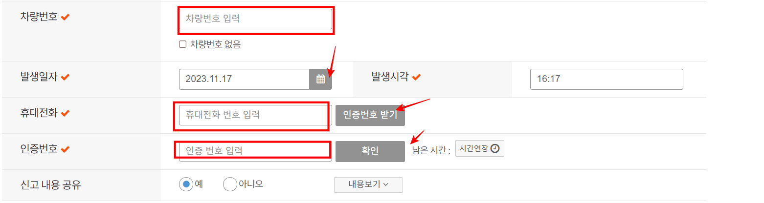 이후 신고할 차량번호, 발생일자, 발생시각, 휴대전화 번호 입력 후 인증번호 받기를 클릭하시고 인증번호가 전송되면 입력 후 우측의 확인 버튼을 클릭합니다.