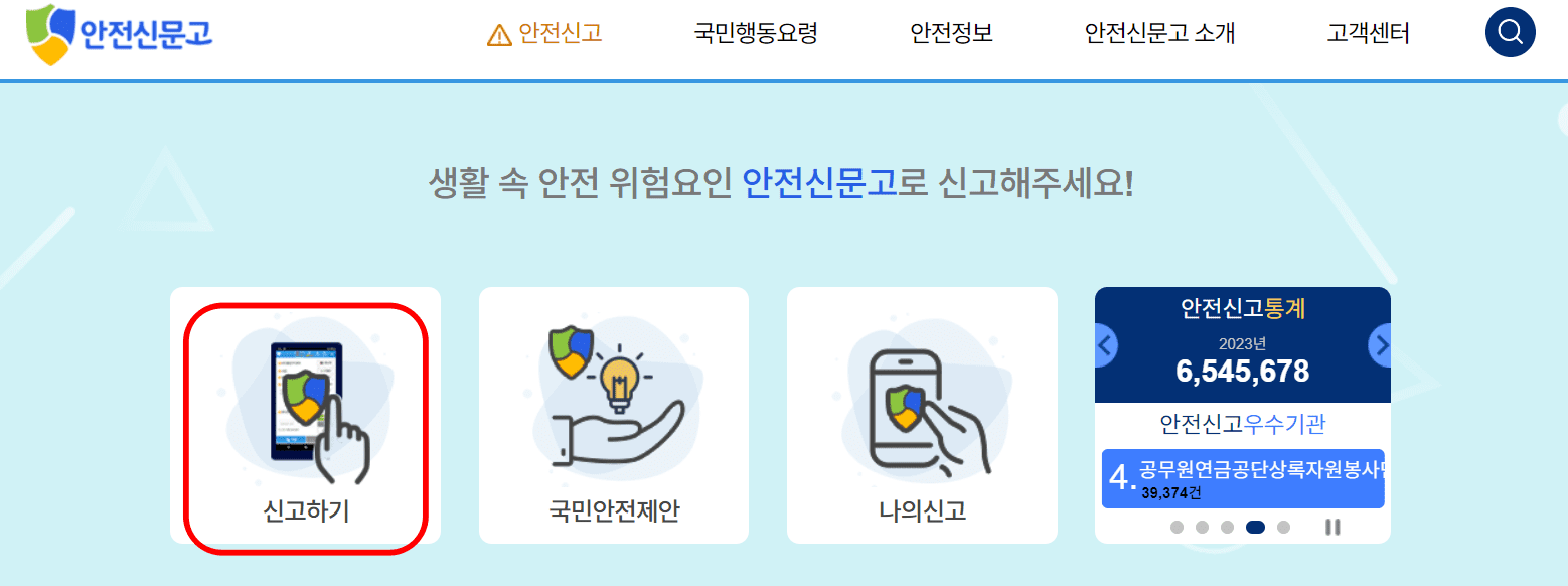재난 또는 그 밖의 사고·위험으로부터 국민의 안전을 확보하기 위하여 안전위험 상황을 행정기관 등에 신고하는 행위입니다.