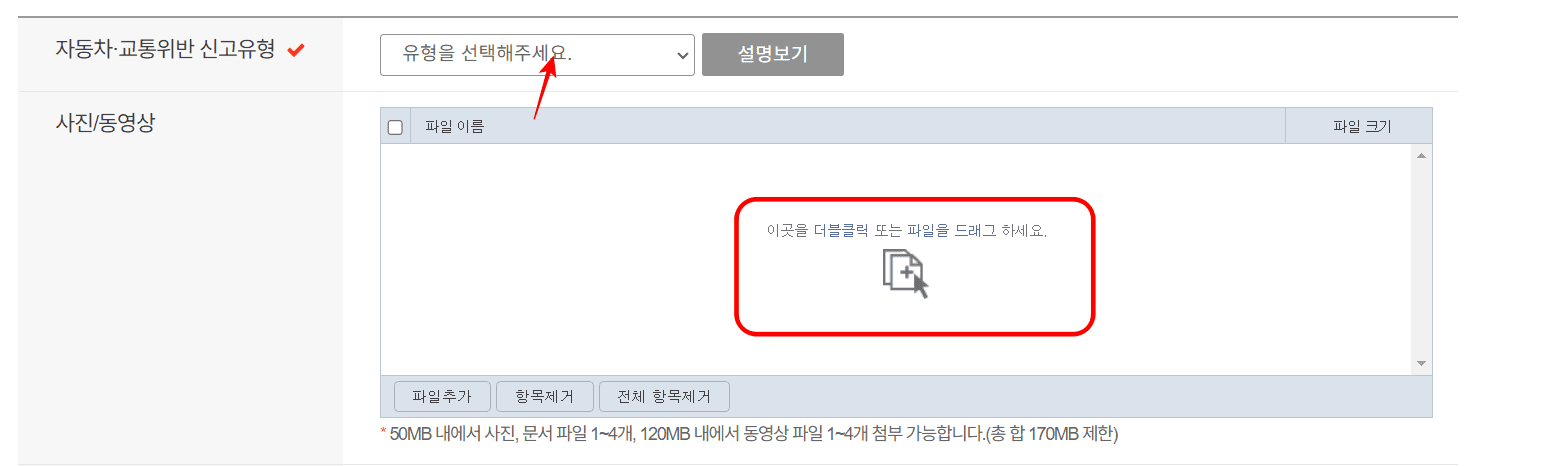 자동차 교통위반 신고유형을 클릭하여 알맞는 유형을 선택합니다. 이후 위반 사실을 증명할 수 있는 사진이나 동영상을 하단에 첨부합니다.