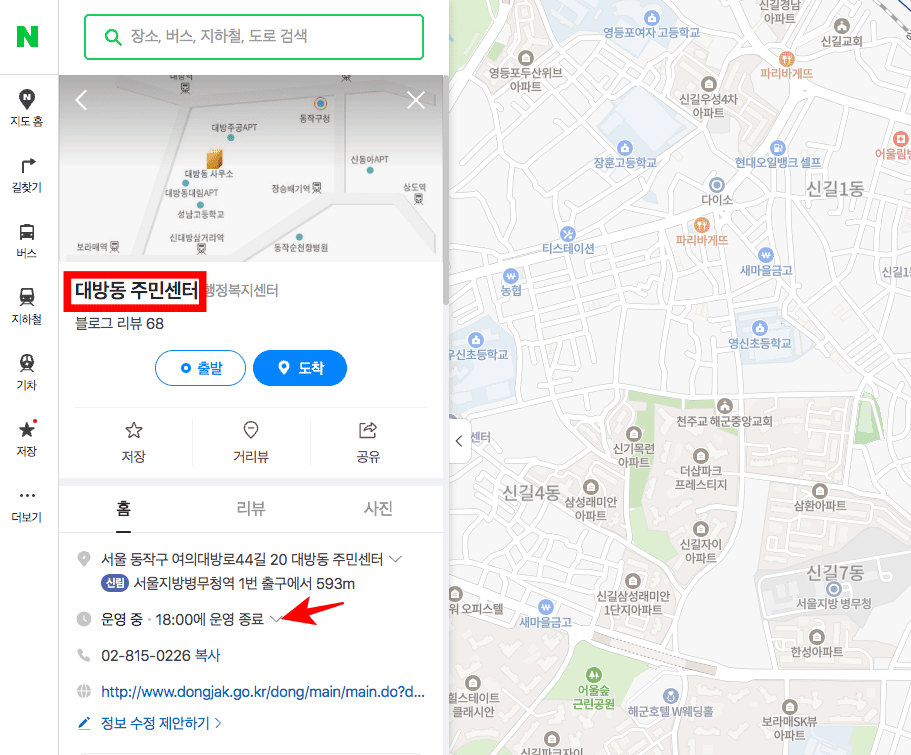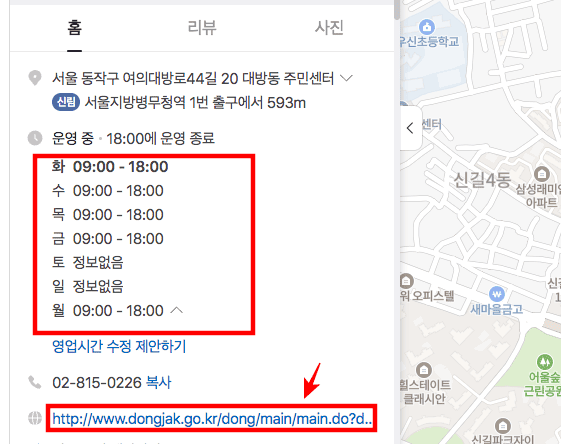 이번에는 서울 동작구에 위치한 대방동 주민센터를 조회해 보겠습니다. 마찬가지로 영업시간 우측의 화살표를 클릭합니다. 대방동 주민센터는 점심시간이 표시되어 있지 않는 것을 확인할 수 있습니다. 이때는 하단의 주민센터 홈페이지를 방문합니다.