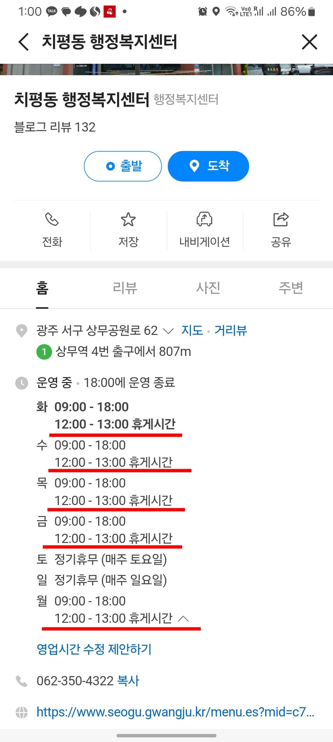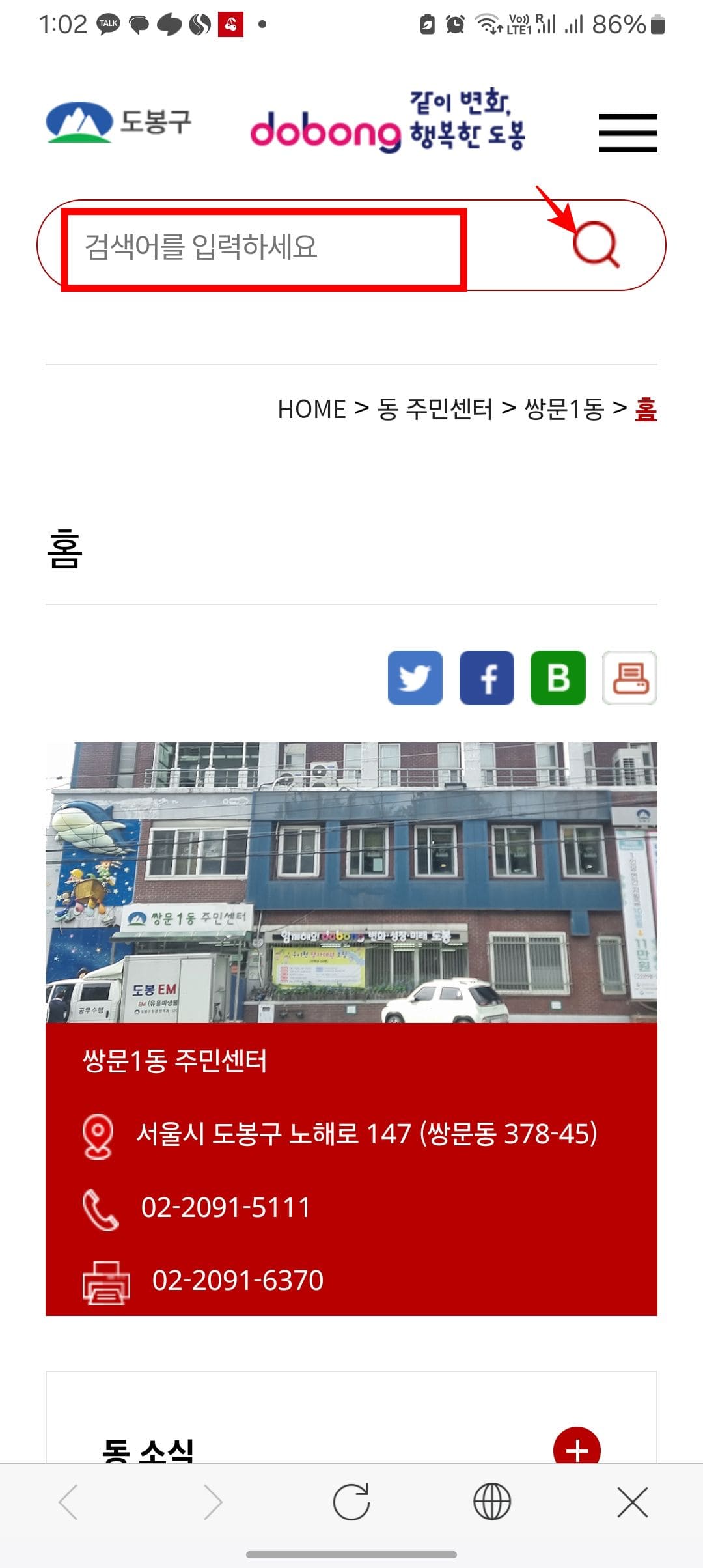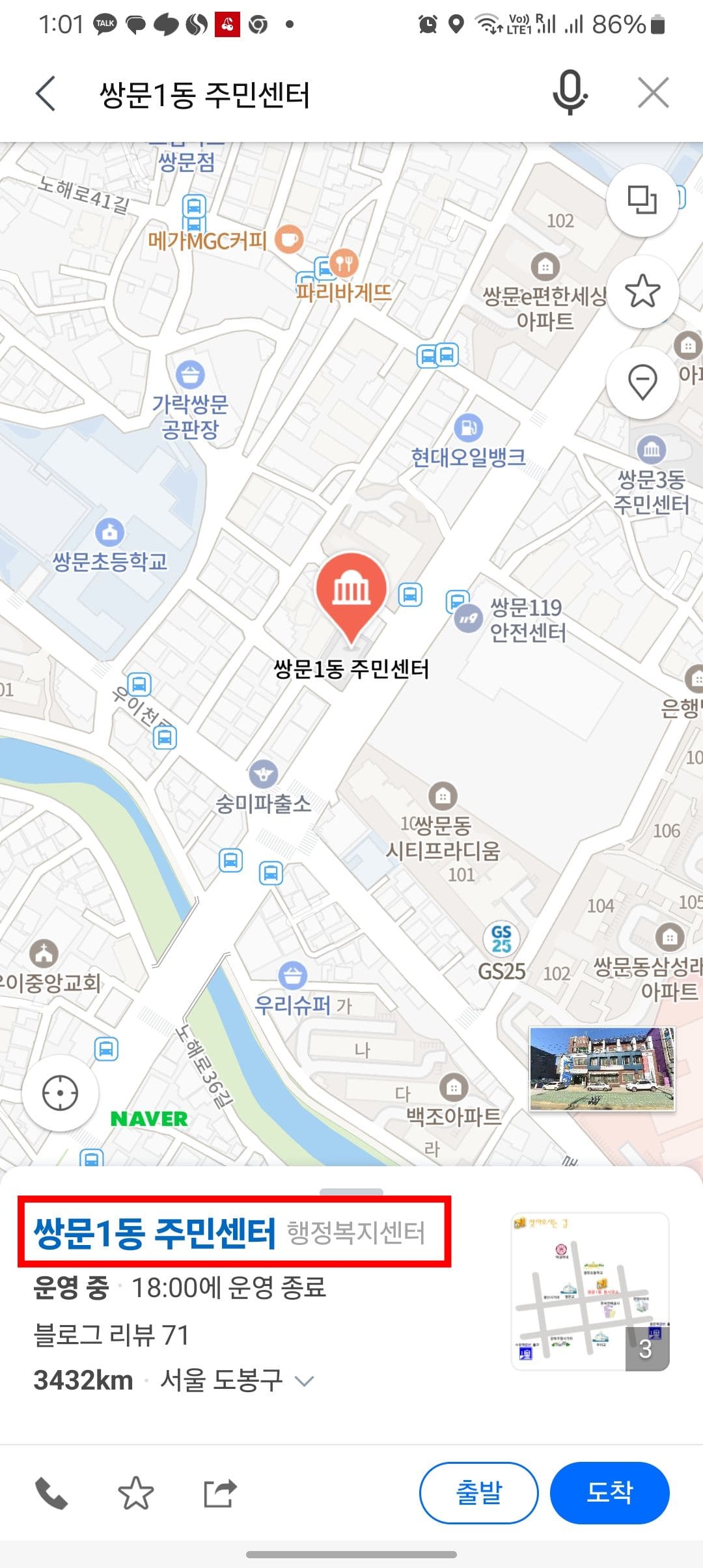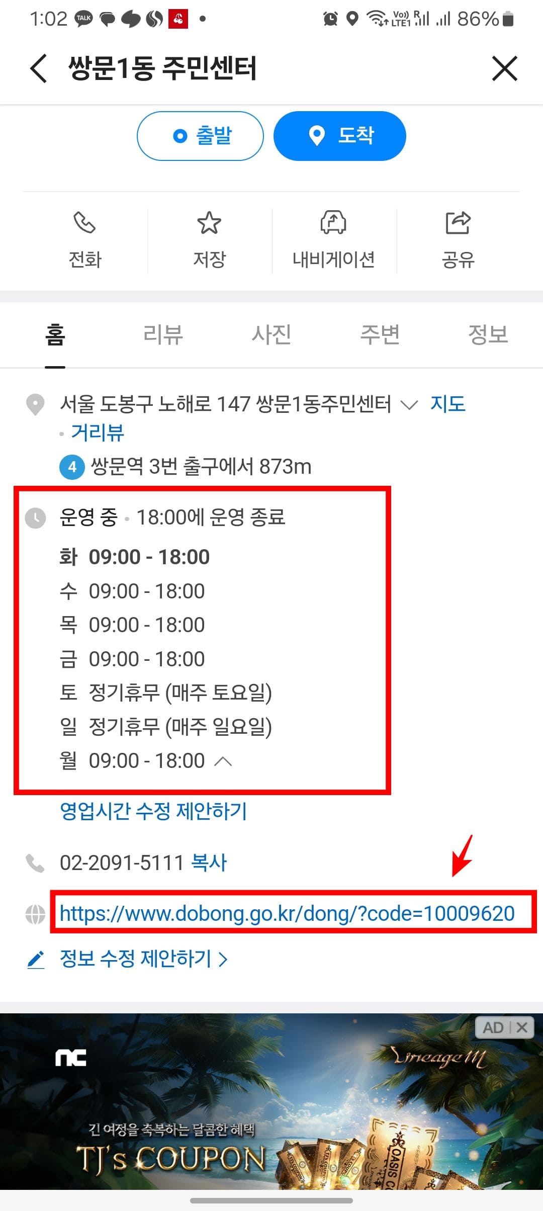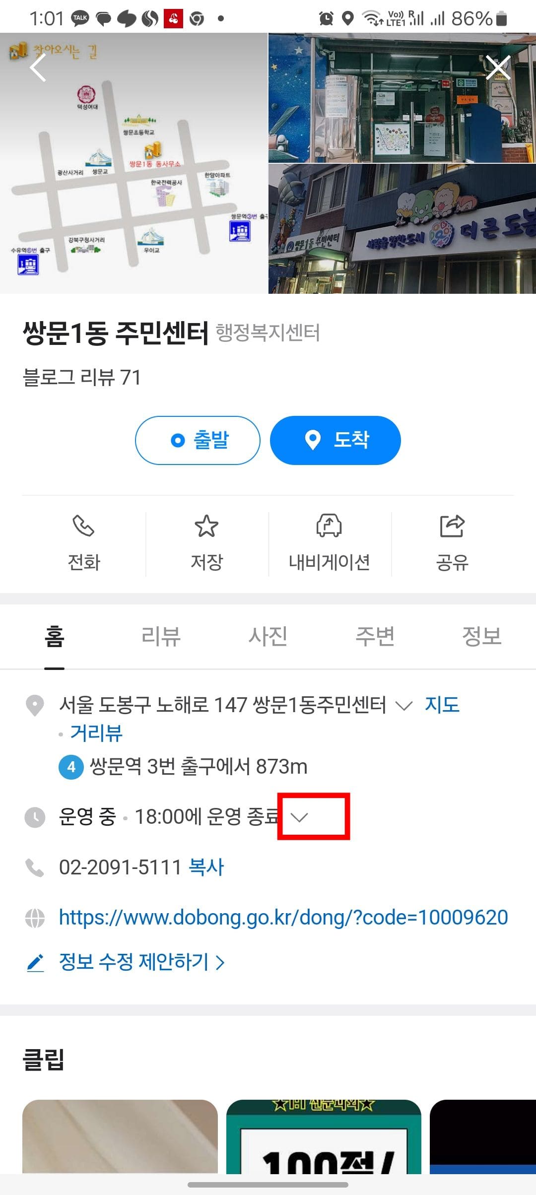 이번에는 쌍문 1동 주민센터를 검색해 보았습니다. 상세정보를 보시고 영업시간 우측의 화살표를 터치합니다. 하단에 영업시간이 표시되지만 점심시간은 표시되지 않습니다. 이때는 하단의 주민센터 홈페이지를 터치하여 이동합니다.