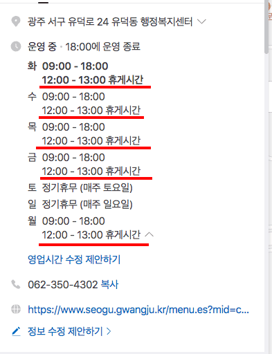 오늘은 주민센터 점심시간 조회 방법에 대해 알아보았습니다. 지방의 주민센터와는 다르게 서울의 주민센터는 네이버 지도에서 점심시간을 찾을 수 없으니 홈페이지에서 검색하거나 직접 전화로 문의하시기 바랍니다.