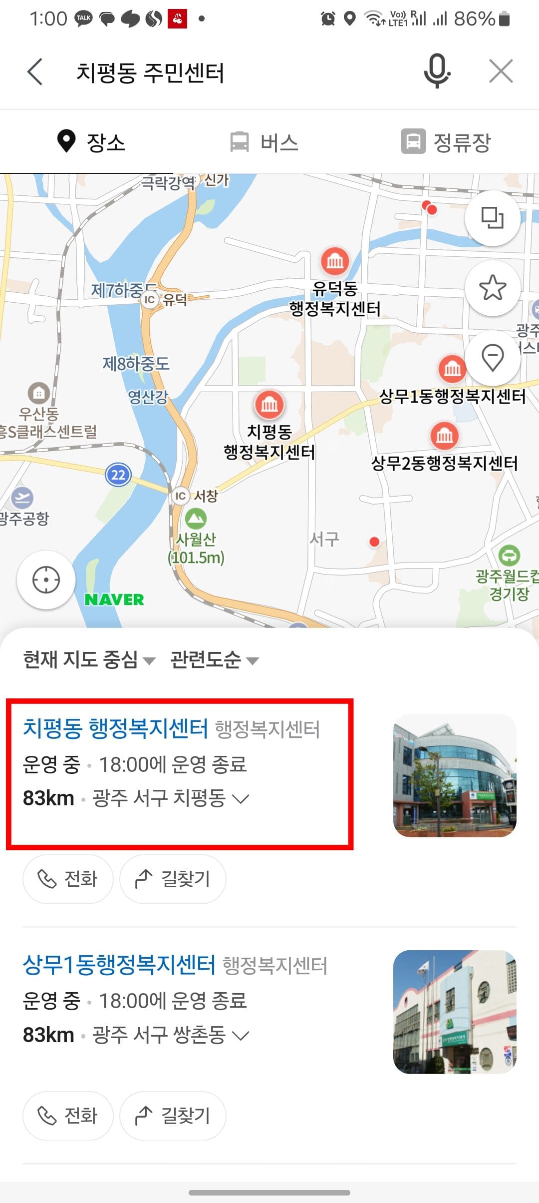 네이버 지도 앱을 실행하시면 위와 같은 메인 화면을 볼 수 있습니다. 상단 검색창에 점심시간을 알고 싶은 주민센터를 입력합니다. 치평동 주민센터를 검색했고 하단에 표시된 주민센터 이름을 터치합니다.