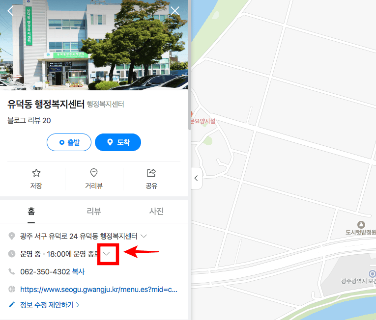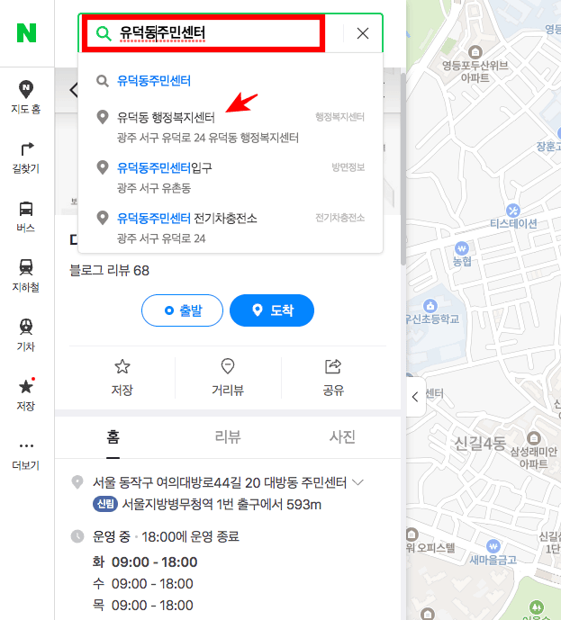 네이버 지도 페이지에 방문하시면 위와 같은 화면을 보게 됩니다. 좌측 상단의 검색창에 점심시간을 알고 싶은 주민센터 이름을 입력하고 조회합니다. 여기에서는 광주 서구의 유덕동 주민센터를 검색해 보았습니다.