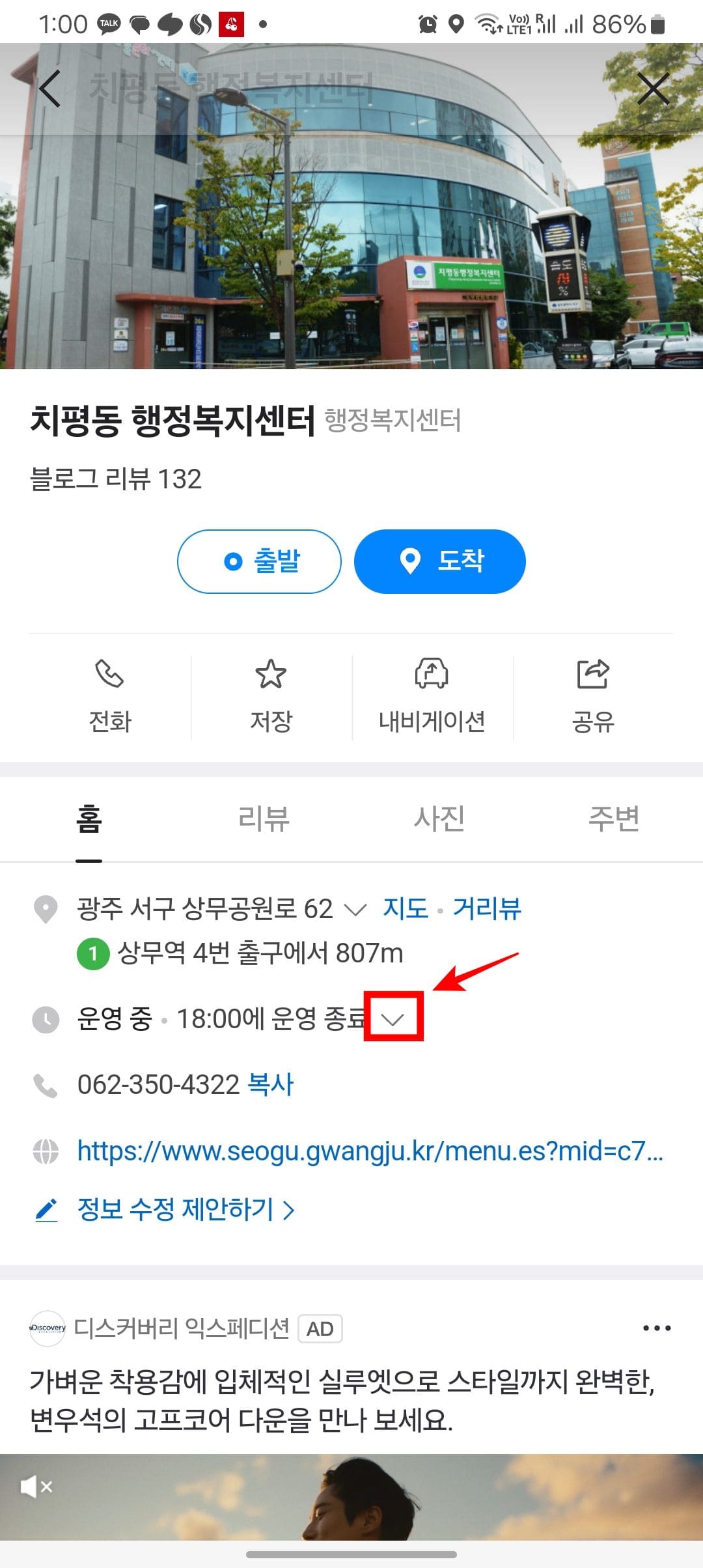 상세정보가 보이면 영업시간 우측의 화살표를 터치합니다. 이후 하단에서 요일별 점심시간을 상세히 확인할 수 있습니다.