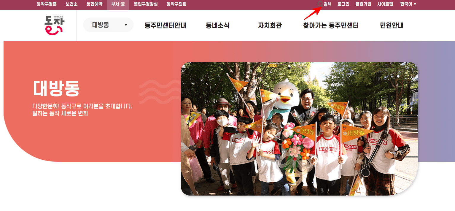 동작구 홈페이지로 이동하신 후 검색 메뉴를 찾아 클릭합니다. 검색창에 [점심시간]을 입력하고 우측의 돋보기 아이콘을 클릭합니다.