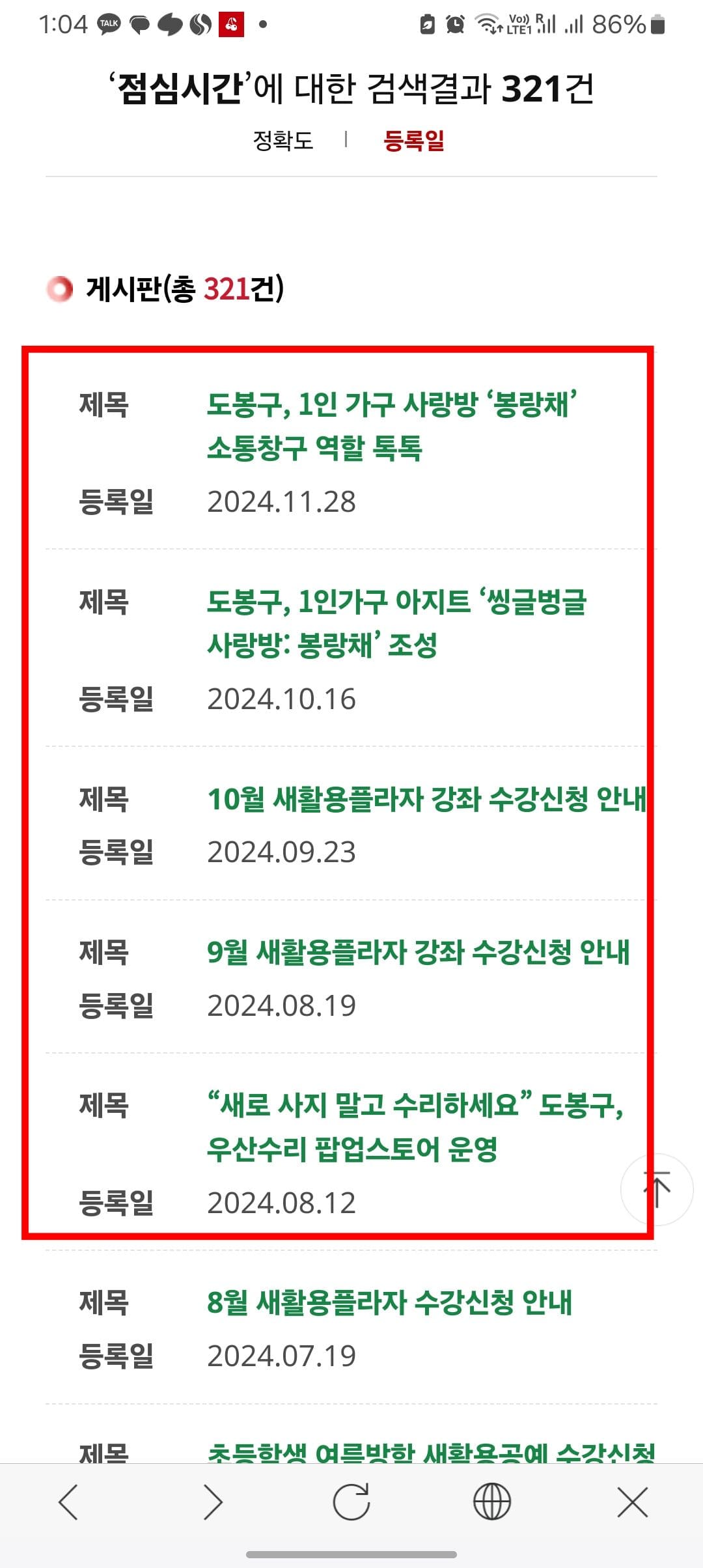 도봉구 홈페이지 검색창에 점심시간을 입력하고 우측의 돋보기 아이콘을 클릭합니다. 검색된 결과의 게시물을 클릭하면 점심시간이 안내된 글을 찾을 수 있으니 직접 확인해 보시기 바랍니다.