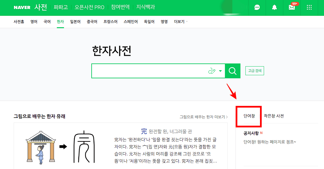 네이버 한자사전 홈페이지에 방문하면 위와 같은 메인 페이지를 확인할 수 있습니다. 우측 하단의 [단어장] 메뉴를 선택합니다. 한자단어장 창이 뜨면 하단에서 [천자문] 메뉴를 선택합니다.