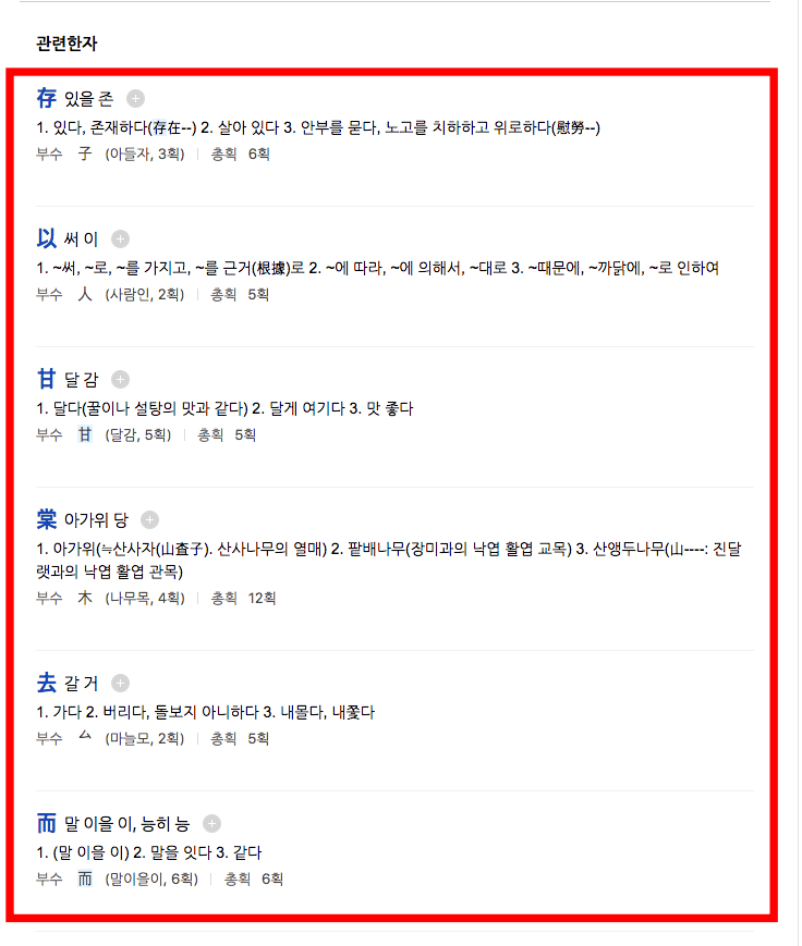 스크롤을 내려보시면 각 한자의 음과 뜻, 부수, 총획 등 세부 정보를 확인할 수 있으니 직접 시도해 보시기 바랍니다.