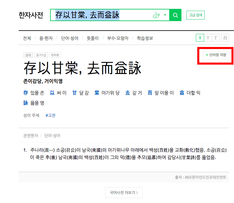 외우고 싶은 문장을 찾았다면 문장을 클릭해봅니다. 페이지가 이동되면서 해당 문장에 포함된 모든 한자의 음과 뜻을 확인할 수 있고 전체 문장의 뜻까지 보입니다.