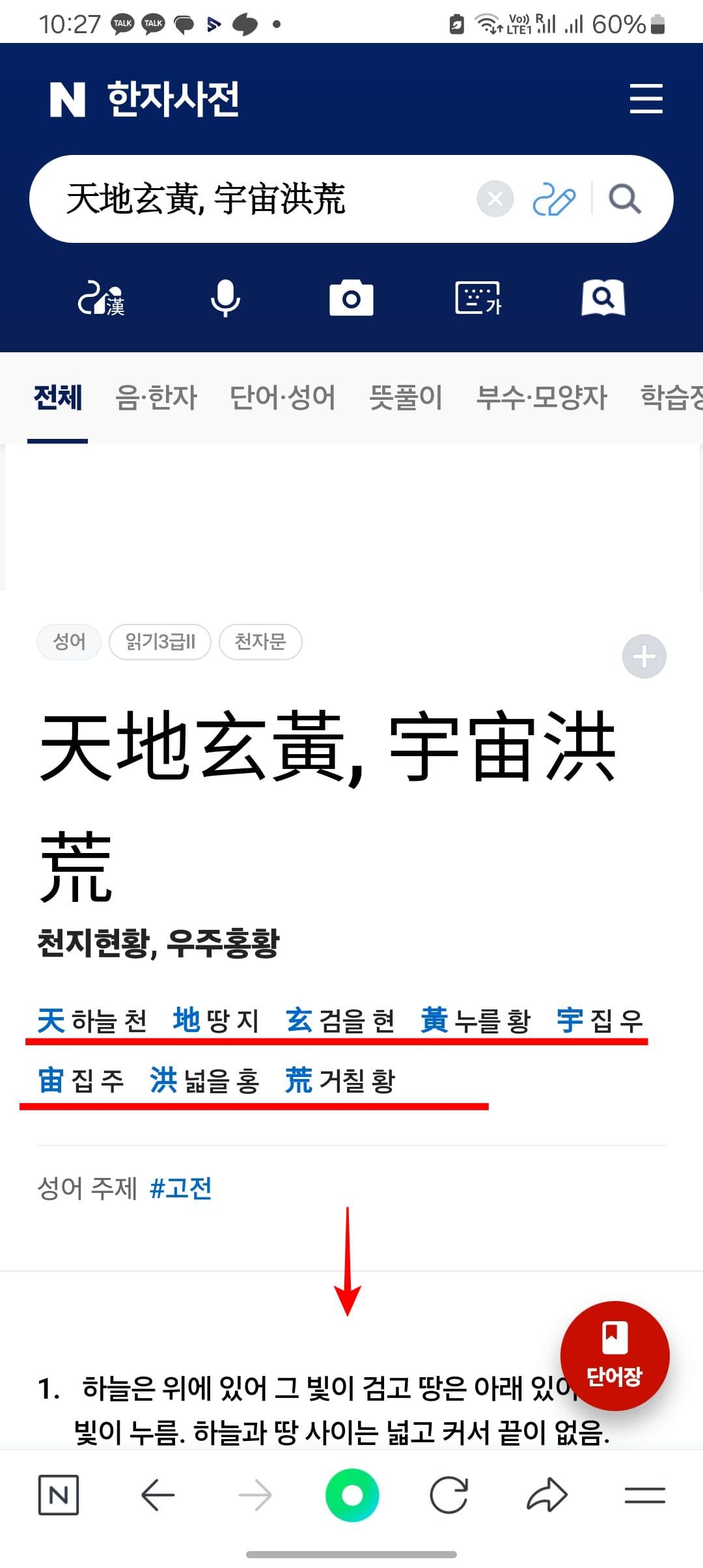 모바일에서 네이버 한자사전 페이지에 방문하면 위와 같은 메인 페이지를 보게 됩니다. 스크롤을 내리면 추천 단어장에서 천자문을 확인할 수 있습니다. 터치해 보면 천자문이 순서대로 표시되는 것을 확인할 수 있습니다.