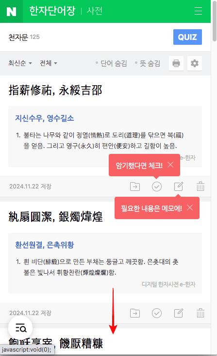 이후 다시 단어장을 클릭하고 한자 단어장에서 내가 찾은 단어를 선택합니다. 내가 찾은 단어장 속에서 방금 저장한 천자문 문장을 확인할 수 있습니다. 만약 암기를 하셨다면 하단의 체크 아이콘을 클릭하여 암기를 완료할 수 있습니다.