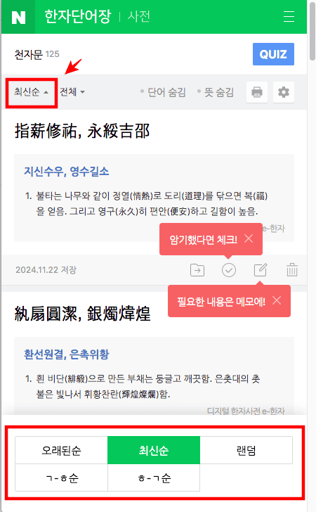 좌측 상단 메뉴에서 최신순을 클릭하면 하단에 천자문 보기 방식을 변경할 수 있습니다. 오래된순, 랜덤, ㄱ-ㅎ순 등이 있으니 원하는 방식을 선택해 보면 위와 같이 천자문의 순서를 변경해서 확인할 수 있습니다.