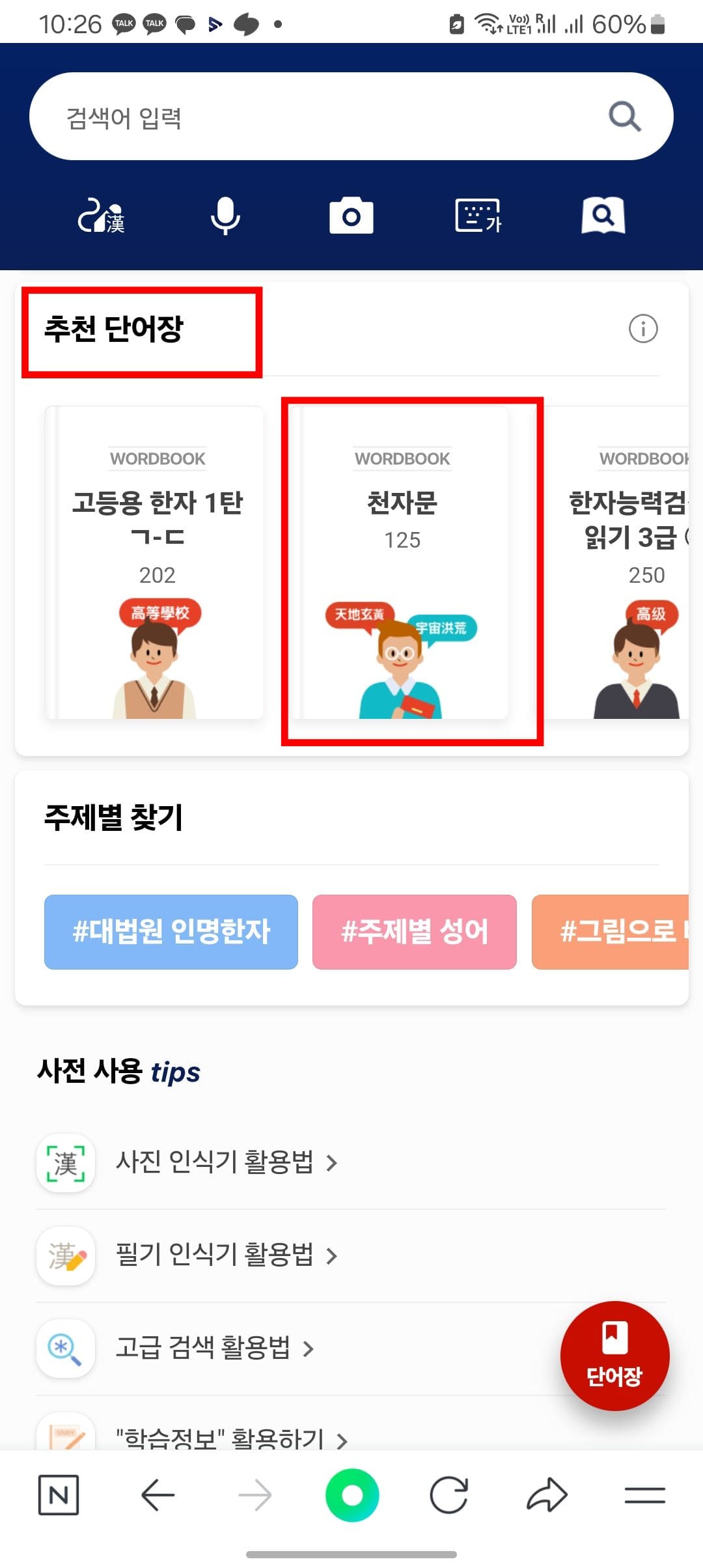 모바일에서 네이버 한자사전 페이지에 방문하면 위와 같은 메인 페이지를 보게 됩니다. 스크롤을 내리면 추천 단어장에서 천자문을 확인할 수 있습니다. 터치해 보면 천자문이 순서대로 표시되는 것을 확인할 수 있습니다.
