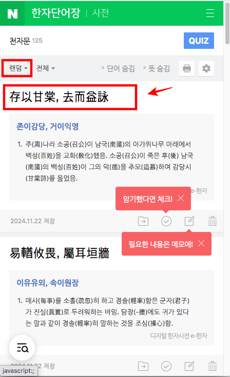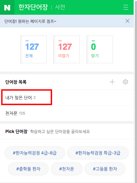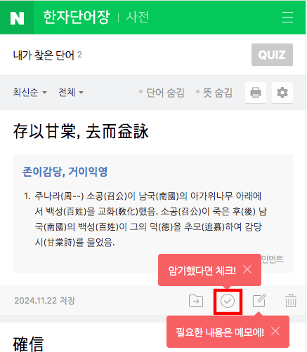 이후 다시 단어장을 클릭하고 한자 단어장에서 내가 찾은 단어를 선택합니다. 내가 찾은 단어장 속에서 방금 저장한 천자문 문장을 확인할 수 있습니다. 만약 암기를 하셨다면 하단의 체크 아이콘을 클릭하여 암기를 완료할 수 있습니다.