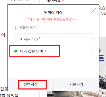 만약 찾은 문장을 기억해두고 싶으시다면 위에서 보이는 것처럼 우측 상단의 [단어장 저장] 메뉴를 선택합니다. 단어장 저장 창이 표시되면 내가 찾은 단어 또는 새 폴더 추가로 폴더를 만든 후 선택저장합니다. 단어장 저장 창에서 하단의 저장 버튼을 클릭합니다.