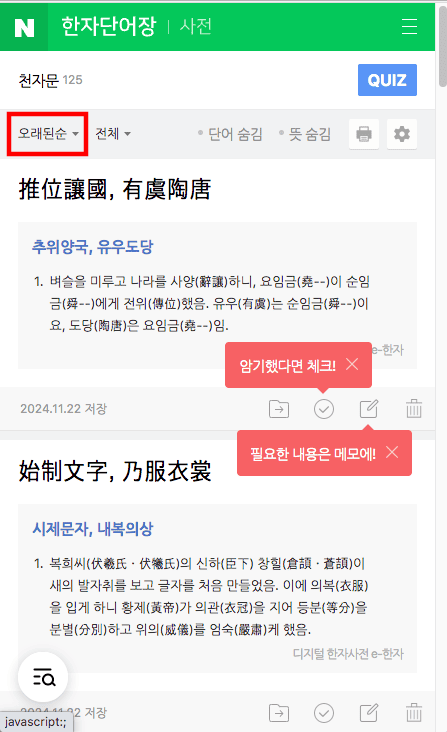 좌측 상단 메뉴에서 최신순을 클릭하면 하단에 천자문 보기 방식을 변경할 수 있습니다. 오래된순, 랜덤, ㄱ-ㅎ순 등이 있으니 원하는 방식을 선택해 보면 위와 같이 천자문의 순서를 변경해서 확인할 수 있습니다.