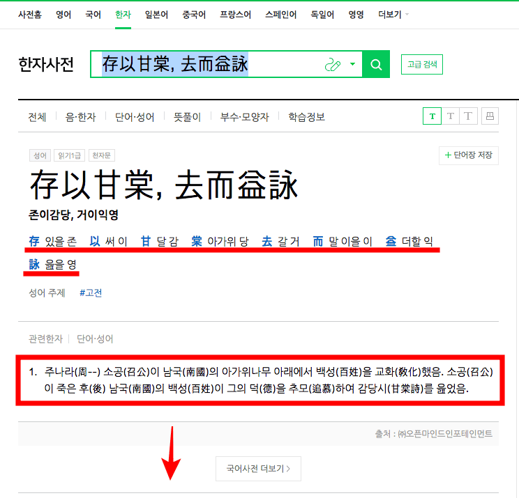 외우고 싶은 문장을 찾았다면 문장을 클릭해봅니다. 페이지가 이동되면서 해당 문장에 포함된 모든 한자의 음과 뜻을 확인할 수 있고 전체 문장의 뜻까지 보입니다.