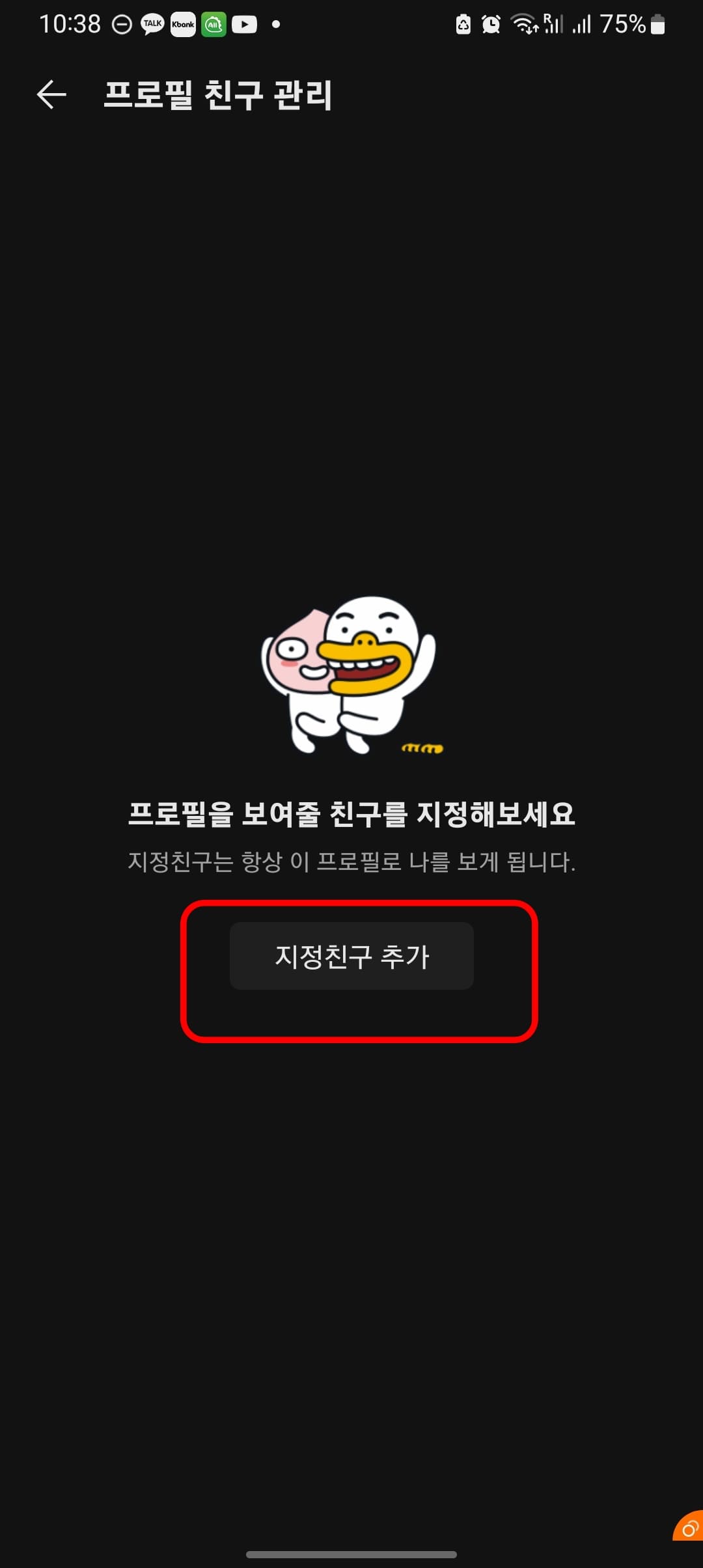 프로필 친구 관리 메뉴에서 지정친구 추가 버튼을 터치합니다. 자신과 연결된 친구 목록에서 멀티프로필을 보여줄 친구를 선택하고 우측 상단의 확인 버튼을 터치합니다.