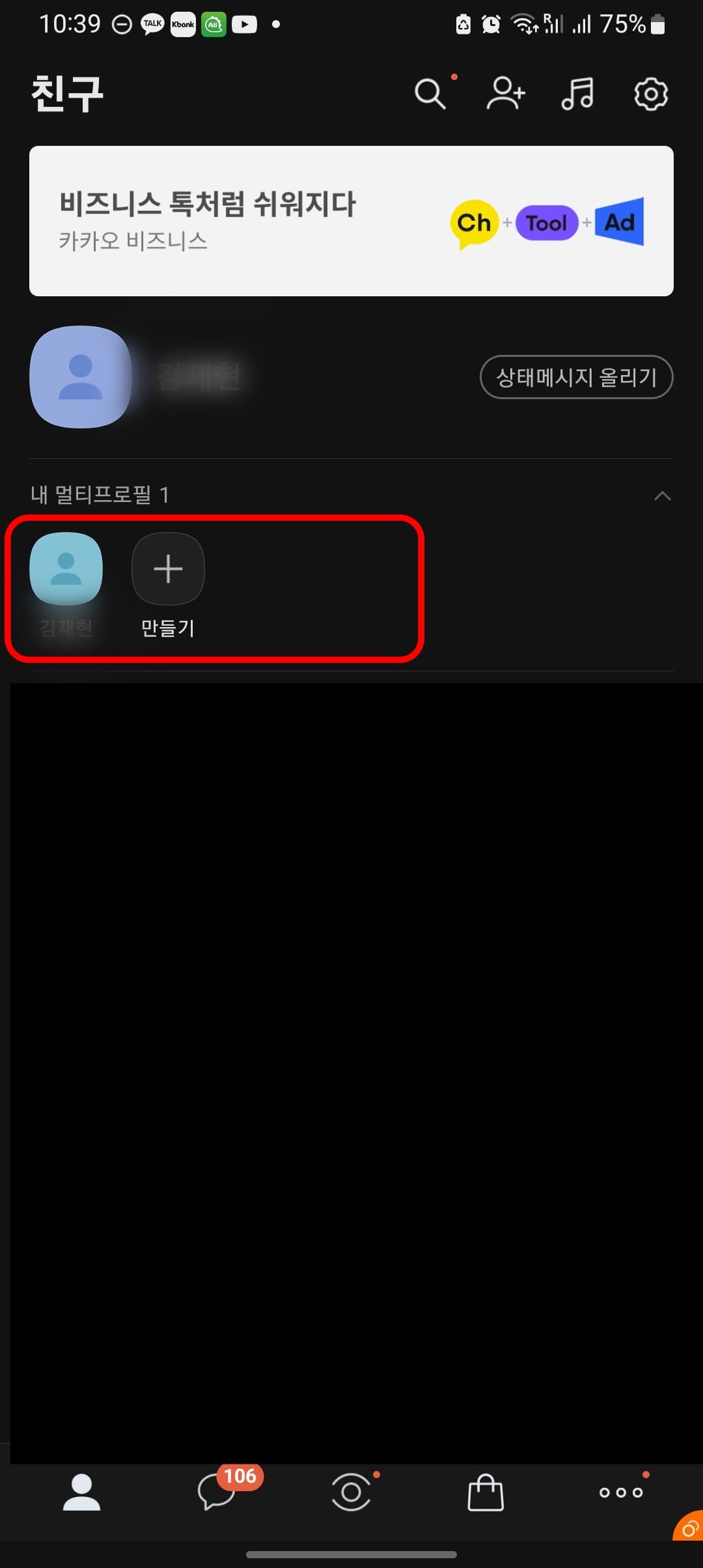 카톡 홈 화면이 실행되면 위의 사진과 같은 화면이 표시됩니다. ‘내 멀티프로필’의 + 버튼을 터치합니다. 프로필 화면이 표시되면 하단에서 ‘친구 관리’ 메뉴를 터치합니다.